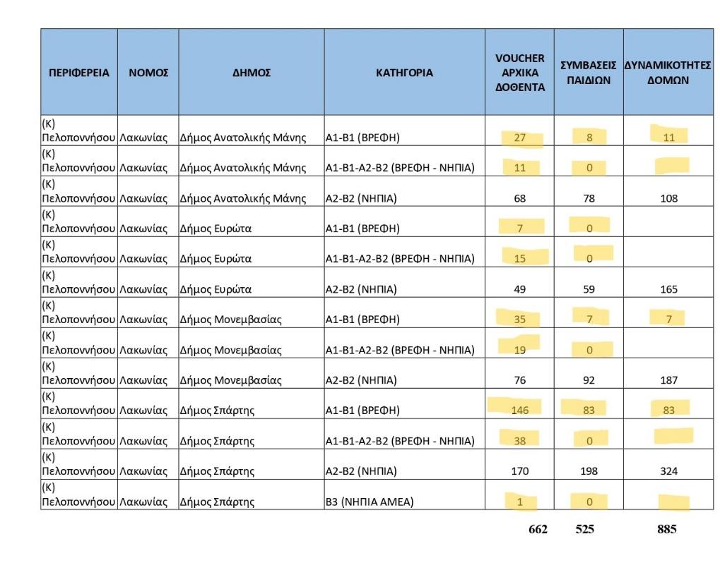 Όπως προκύπτει από τον παραπάνω πίνακα, ο οποίος περιλαμβάνεται στην Απάντηση του Υπουργείου, τα στοιχεία ανά Δήμο για τις κατηγορίες Α1-Β1 (ΒΡΕΦΗ), καθώς και για την ενδιάμεση κατηγορία Α1-Β1-Α2-Β2 (ΒΡΕΦΗ – ΝΗΠΙΑ) αποκαλύπτουν πως δόθηκαν 298 voucher για τις συγκεκριμένες κατηγορίες ενώ οι αντίστοιχες θέσεις στις εν λόγω δομές ήταν μόλις 101!