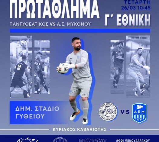 Για όλα τα παραπάνω, άλλαξε το πρόγραμμα του πρωταθλήματος και δεν έχουμε αγωνιστική την προσεχή Κυριακή, αλλά την επόμενη Τετάρτη όπου ο Πανγυθειατικός μας υποδέχεται τη Μύκονο στις 10.45….το πρωί!