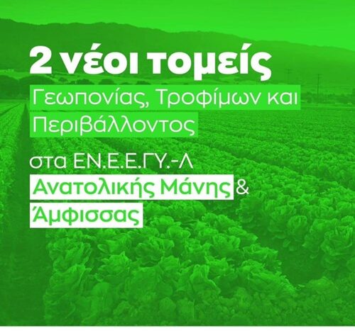 Με απόφαση της Υπουργού Παιδείας, Θρησκευμάτων και Αθλητισμού κας Ζαχαράκη ιδρύονται δύο νέοι τομείς στο ΕΝ.Ε.Ε.ΓΥ.-Λ. Ανατολικής Μάνης, που στεγάζεται στην Πετρίνα.